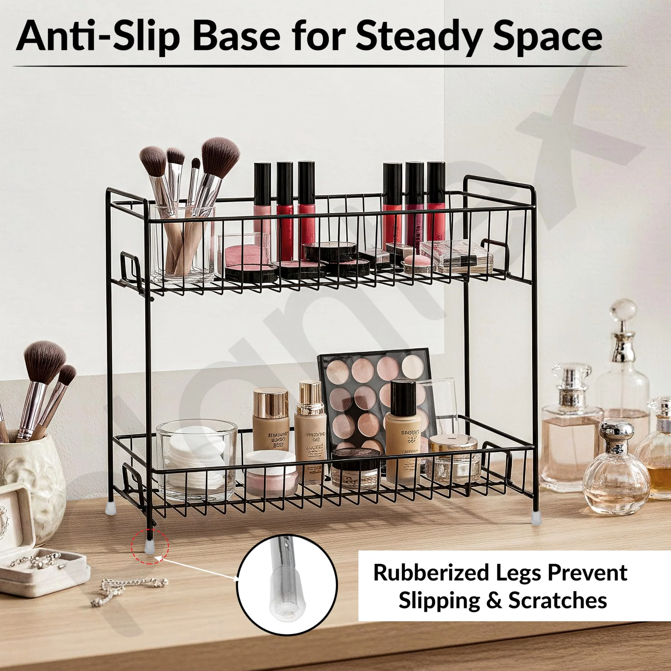 - ๐๐๐ญ๐๐ซ๐ข๐๐ฅ: This Plantex 2-tier kitchen organizer rack is made from strong stainless-steel wires and the side frame is made from durable pipes with black finish. Which is rust-proof, scratch-proof and corrosion-free making it durable and long life.