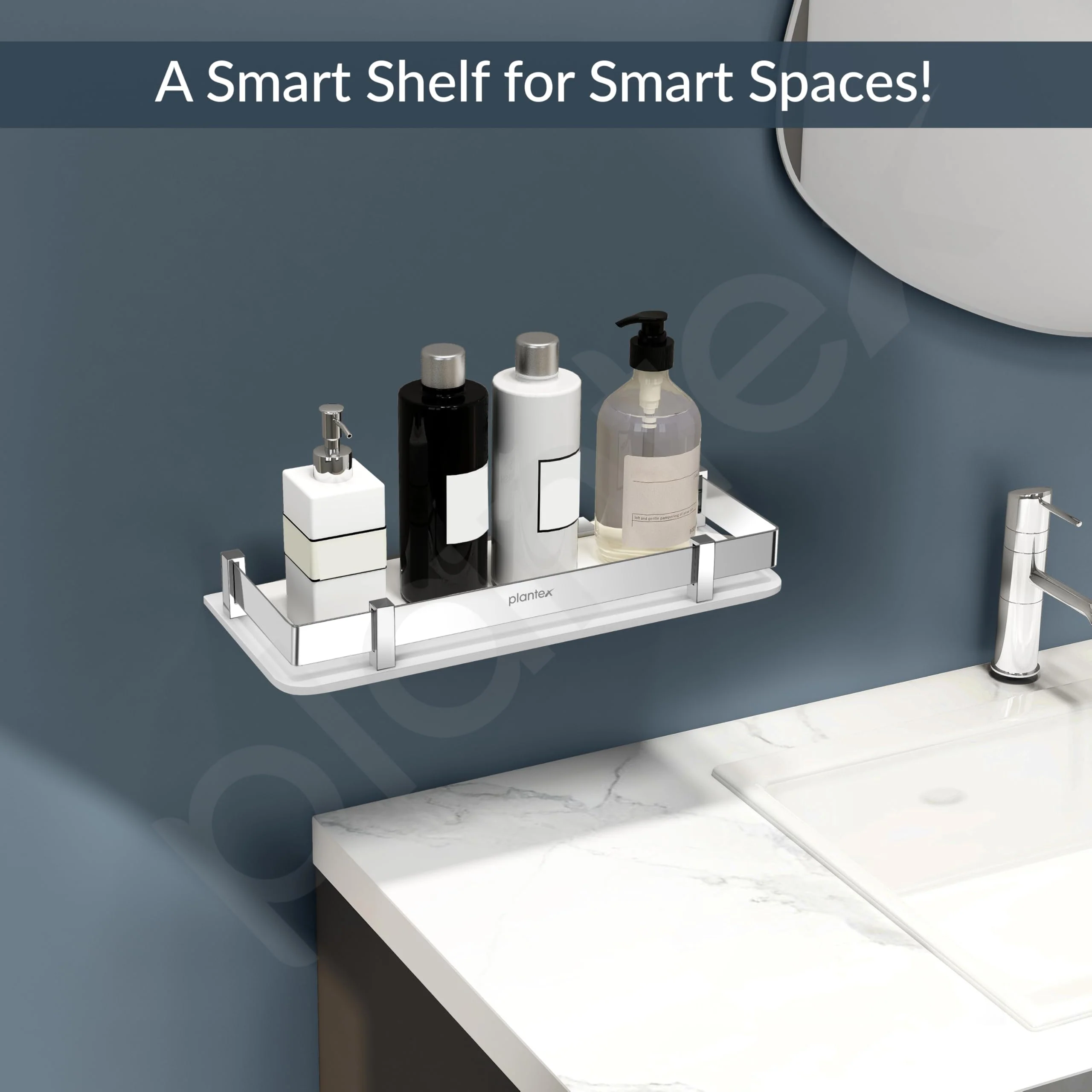 - ๐๐๐ญ๐๐ซ๐ข๐๐ฅ: Plantex wall shelf for bathroom is strongly durable as 5 mm best quality acrylic is used for its manufacturing. Its wall mount clamps/brackets and railings are made from stainless steel which is anti-rust and corrosion-free.