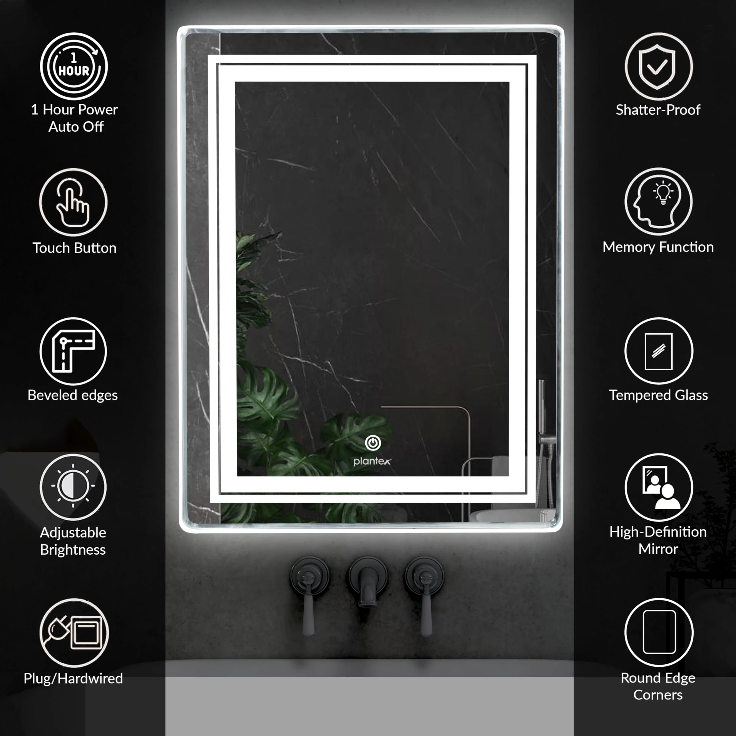 - ๐๐ฅ๐๐ฌ๐ฌ๐ข๐ ๐๐ข๐ซ๐ซ๐จ๐ซ ๐๐๐ญ๐๐ซ๐ข๐๐ฅ: Plantex LED Mirror is Made From a 5mm HD environment-friendly copper-free silver mirror with a classic design, the LED mirror won't get broken easily. Even broken, it won't shatter to pieces, safer to use. (if you receive mirror with defective, please contact us, and we will offer a solution as soon as possible). just like our mirror's classic look that never goes out of style, its quality can also stand the test of time